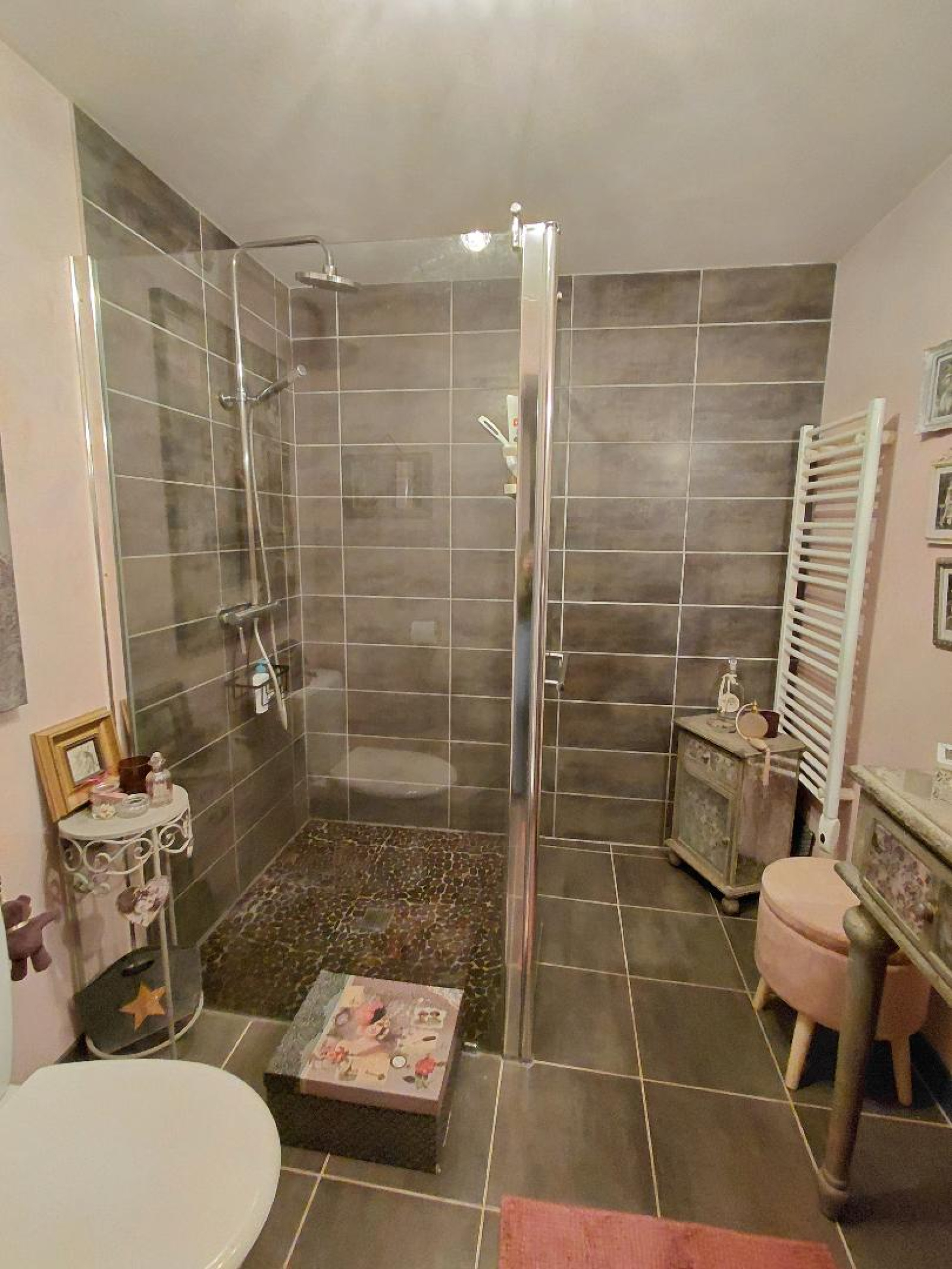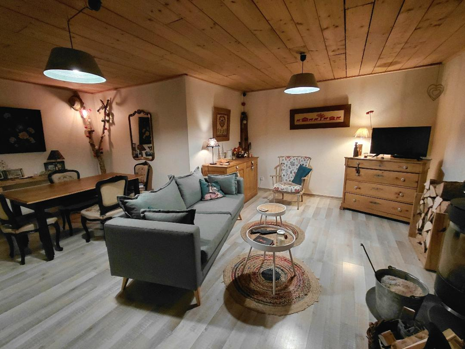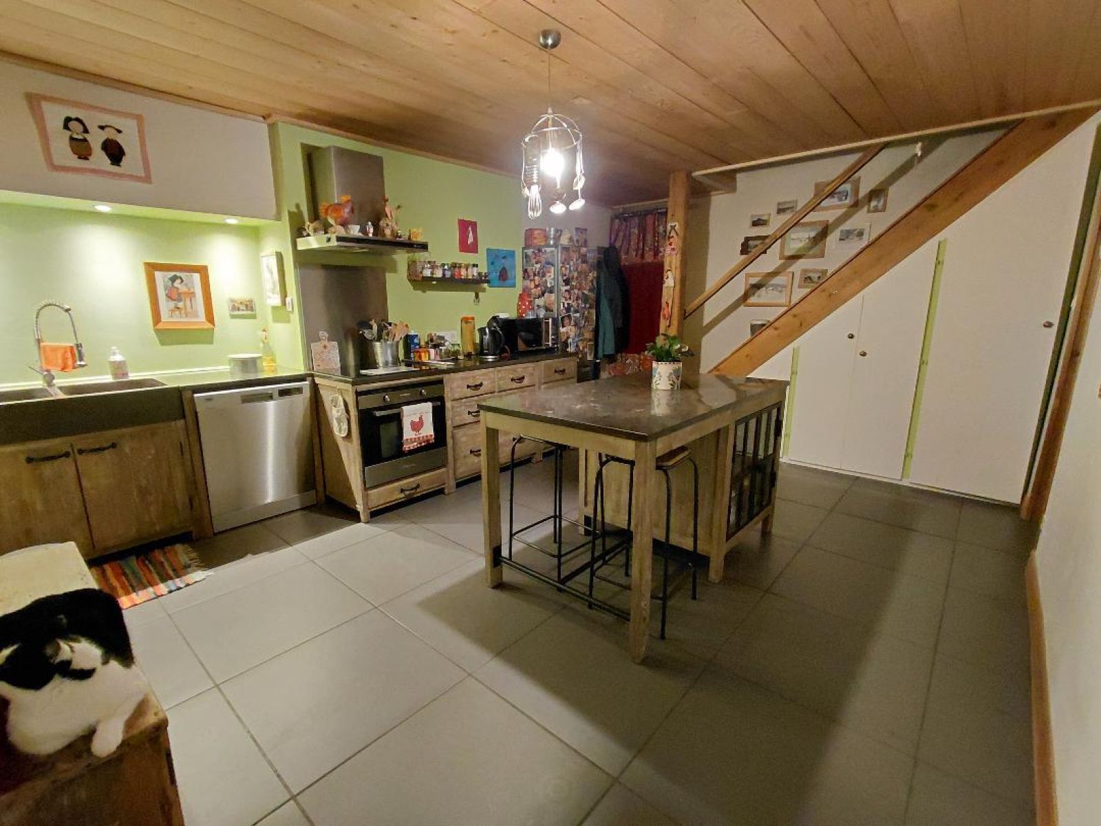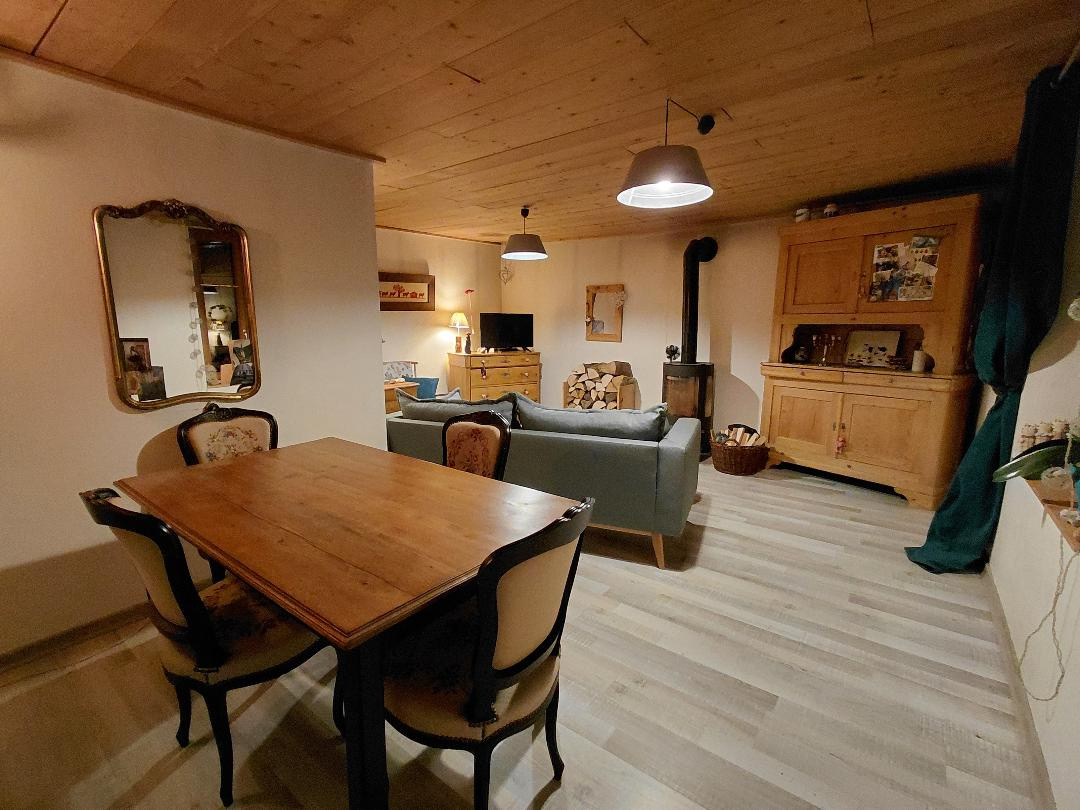Elle est composée, au rez-de-chaussée : une cuisine équipée et aménagée de 2018 avec accès terrasse et jardin, une salle d’eau avec douche italienne, une meuble vasque et un wc, un salon/salle manger avec poêle à bois.
