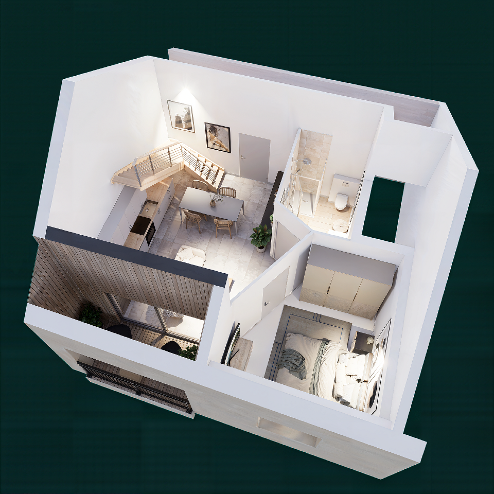 Il est composé: d'une pièce à vivre ouverte sur une cuisine équipée avec accès par baie vitrée à une loggia de 6m², un wc, une salle d'eau, un wc et une chambre.